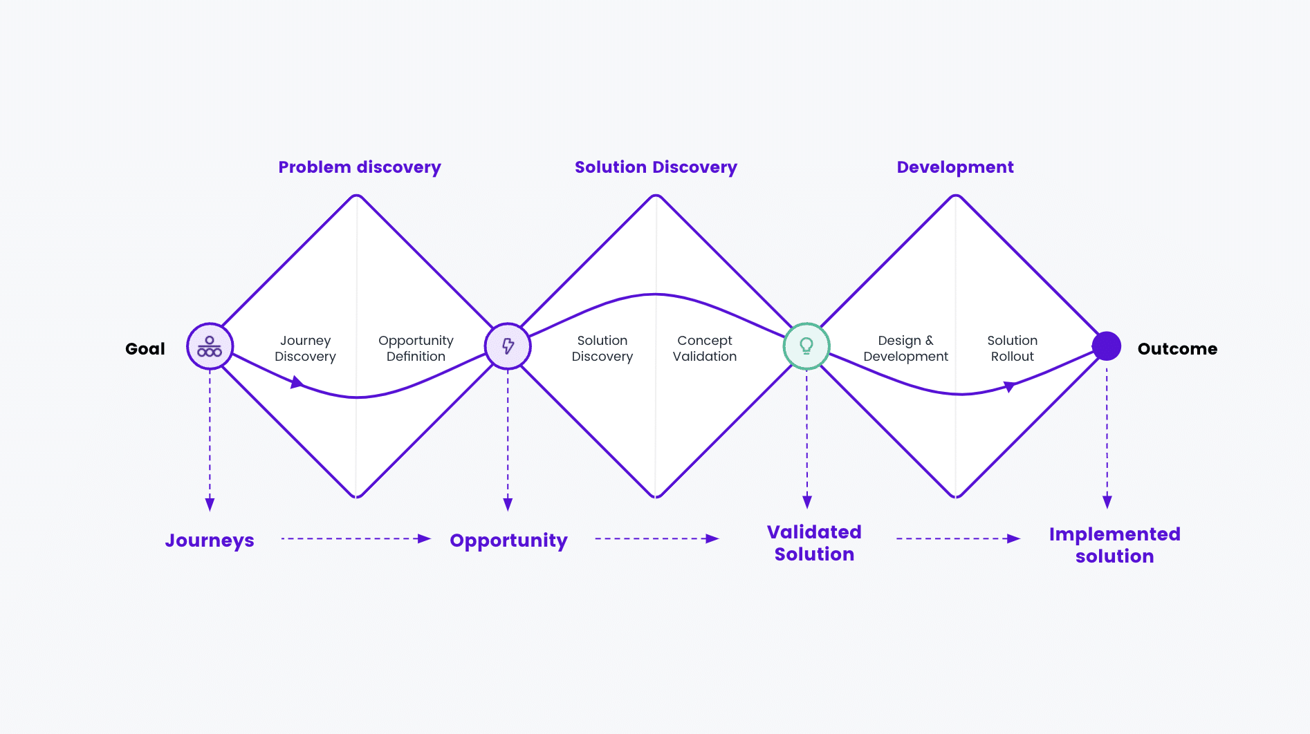 In the triple diamond model of discovery, design, and development, user interviews typically happen during the discovery phase. In design thinking, this is known as the empathizing phase.